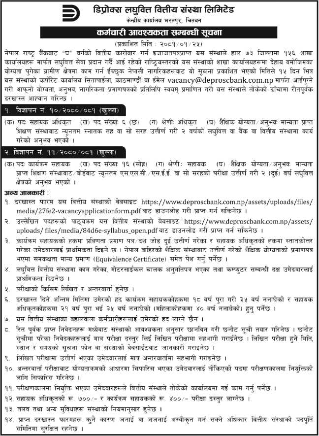 डिप्रोक्स लघुवित्तमा २२ जना कर्मचारी माग, के कति चाहिन्छ योग्यता?