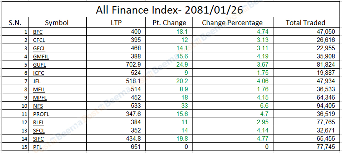 त्यस्तै, आज कारोबार भएका सम्पूर्ण फाइनान्स कम्पनीहरुको शेयरमूल्य बढेको छ । जसमा नेपाल फाइनान्स लिमिटेडको शेयरमूल्य ६ दशमलव ६० प्रतिशतले सर्वाधिक बढेको छ । साथै, श्री इन्भेष्टमेन्ट फाइनान्सको शेयरमूल्य ४ प्रतिशतका साथै अन्य फाइनान्स कम्पनीका लगानीकर्ताहरुको शेयरमूल्य वृद्धि भएको छ ।