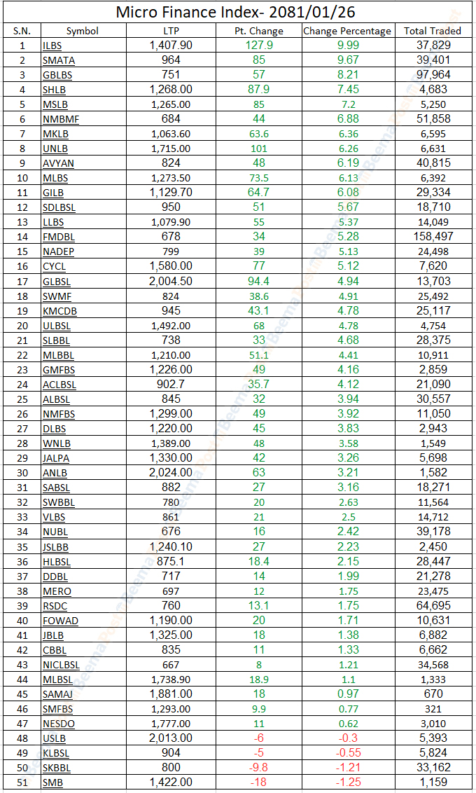 बुधबार नेप्सेमा कारोबार भएका अधिकांश उपसूचकहरु राताम्मे बनेतापनि माइक्रोफाइनान्स उपसूचकमा हरियाली छाएको छ । आज यो उपसूचक २ दशमलव ७६ प्रतिशत अर्थात ११६ अंकले वृद्धि भई ४३,३१७ को विन्दुमा कायम भएको छ । बुधबार यस उपसूचकमा कारोबार भएका ५१ वटा कम्पनीमध्ये ४७ वटा कम्पनीको शेयरमूल्य बढेको छ । यी कम्पनीका लगानीकर्ताहरु मालामाल बनेका छन् ।