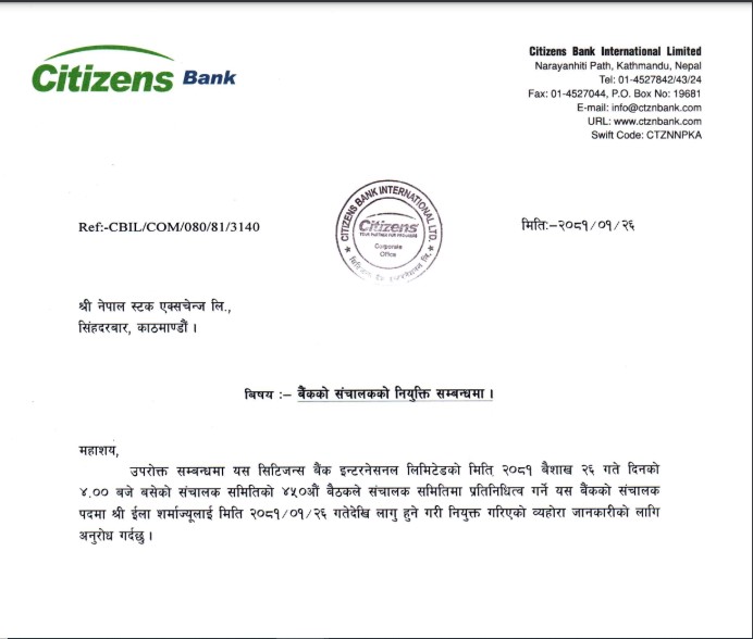 काठमाडौं । सिटिजन बैंकले नयाँ सञ्चालकमा ईला शर्माज्यूलाई चयन गरेको छ । बैंकको बैशाख २६ गते बसेको सञ्चालक समिति बैठकले नयाँ सञ्चालकमा शर्मालाई नियुक्त गरेको हो ।