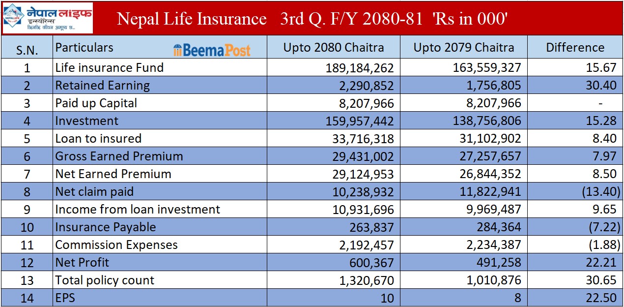 कम्पनीको मुनाफामा बृद्धि हुँदा कम्पनीको प्रतिशेयर आम्दानी ९.८० रुपैयाँ पुगेको छ । त्यस्तै, प्रति शेयर नेटवर्थ १४८.६५ रुपैयाँ रहेको छ । देशमा जारी आर्थिक संकटका बीचमा समग्र जीवन बीमा व्यवसायमा असर परिरहेको समयमा नेपाल लाइफले भने उत्कृष्ट नतिजा दिन सफल भएको छ ।