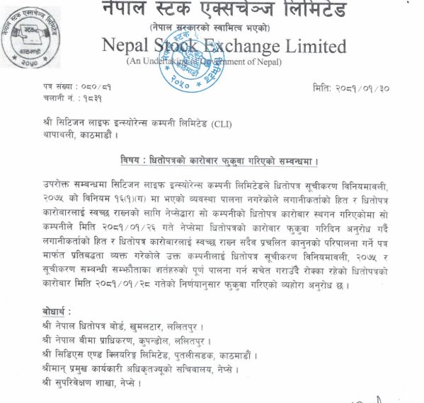 काठमाडौँ । नेपाल स्टक एक्सचेञ्ज (नेप्से) ले सिटिजन लाइफ इन्स्योरेन्सको शेयर कारोबार फुकुवा गरेको छ । नेप्सेले बजारको स्वच्छतामा आँच आएको भन्दै शेयर कारोबार रोक्का गरेको हो ।