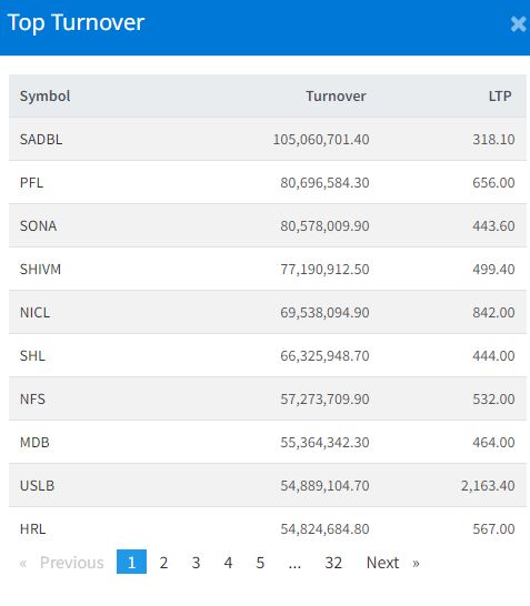 आज लागनीकर्ता सांग्रिला डेभलपमेन्ट बैंकको १० करोड ५० लाख ६० हजार रुपैयाँ, पोखरा फाइनान्सको ८ करोड ६ लाख रुपैयाँ, सोनापुरको ८ करोड ५ लाख रुपैयाँ र शिवम सिमेन्टको ७ करोड ७१ लाख रुपैयाँको कारोबार भएको छ ।
