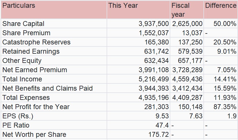 कम्पनीले सार्वजनिक गरेको वित्तिय विवरण अनुसार तेस्रो त्रैमासमा खुद बीमाशुल्क गत आर्थिक वर्षको सोही अवधिको तुलनामा सामान्य बढेको छ भने खुद नाफा उल्लेख्य बढेको छ।