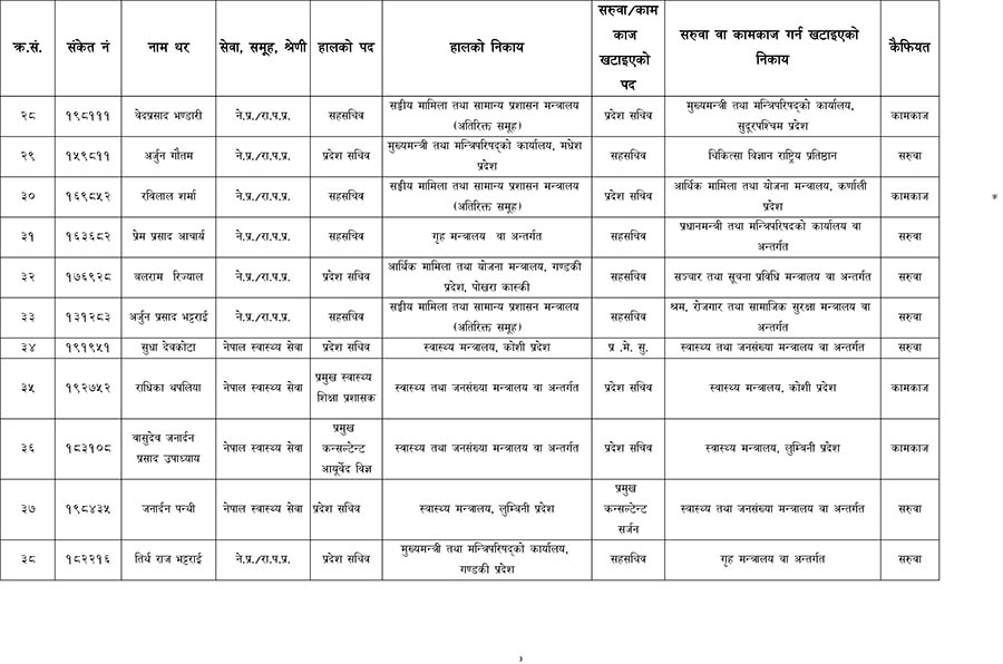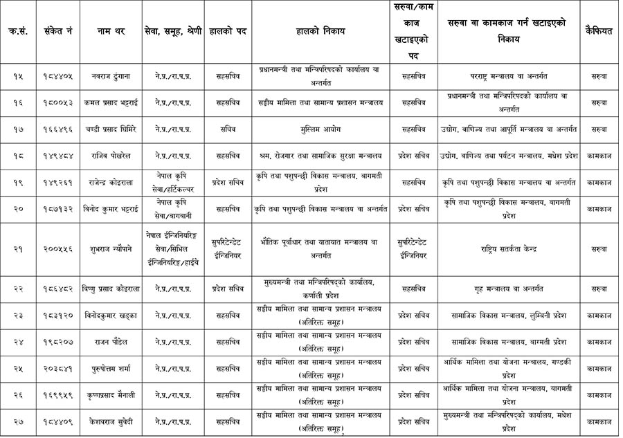 काठमाडौँ। सरकारले एकै पटकमा ठूलो संख्यामा सहसचवहरुको सरुवा गरेको छ । आज बसेको मन्त्रिपरिषद्को बैठकले विभिन्न मन्त्रालय, विभाग र निकायमा कार्यरत रहेका उनीहरुको सरुवा गरेको हो ।