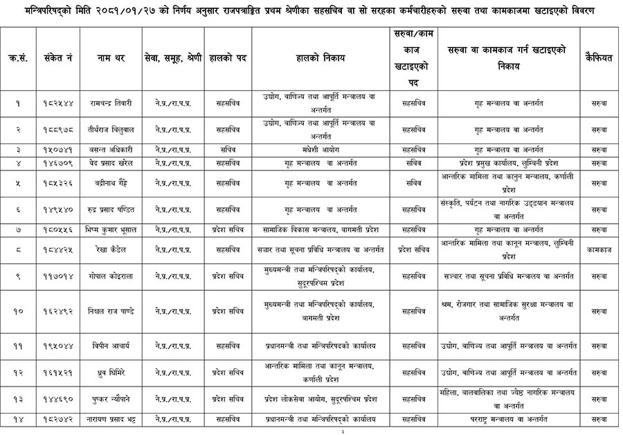 मन्त्रिपरिषद कार्यालयका सहसचिव नारायणप्रसाद भट्ट र नवराज ढुंगानालाई परराष्ट्र मन्त्रालयमा सरुवा गरिएको छ ।