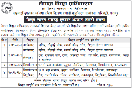 नेपाल विद्युत् प्राधिकरणका अनुसार प्राधिकरणको रत्नपार्क वितरण केन्द्र अन्तरगतका विद्युतीय लाइन भूमिगत गर्ने कार्यका लागि सम्बन्धित फिडर अन्तर्गतका विभिन्न स्थानमा बिहान ११ बजेदेखि साँझ ५ बजेसम्म विद्युत अवरुद्ध हुने भएको हो ।