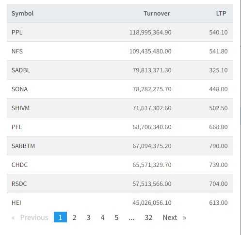 त्यस्तै, नेपाल फाइनान्स, साग्रिला बैंक, सोनापुर मिल्स, शिवम् सिमेन्टस, पोखरा फाइनान्स, सर्वोत्तम सिमेन्टस, सिईडिबी, आरएसडिसी लघुवित्त, हिमालयन रि इन्स्योरेन्सको सर्वाधिक कारोबार भएको छ।