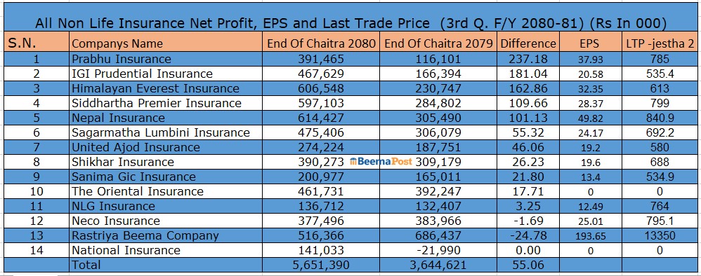 काठमाडौं । हाल नेपालमा सञ्चालित जीवन र निर्जीवन बीमा कम्पनीहरुले चालु आर्थिक वर्षको तेस्रो तैमाससमम्मको अपरिष्कृत वित्तीय विवरण सार्वजनिक गरिसकेका छन् । जस अनुसार अधिकांश कम्पनीहरुका प्रमुख वित्तीय सूचांकहरु उल्लेख्य रुपले वृद्धि भएका छन् ।