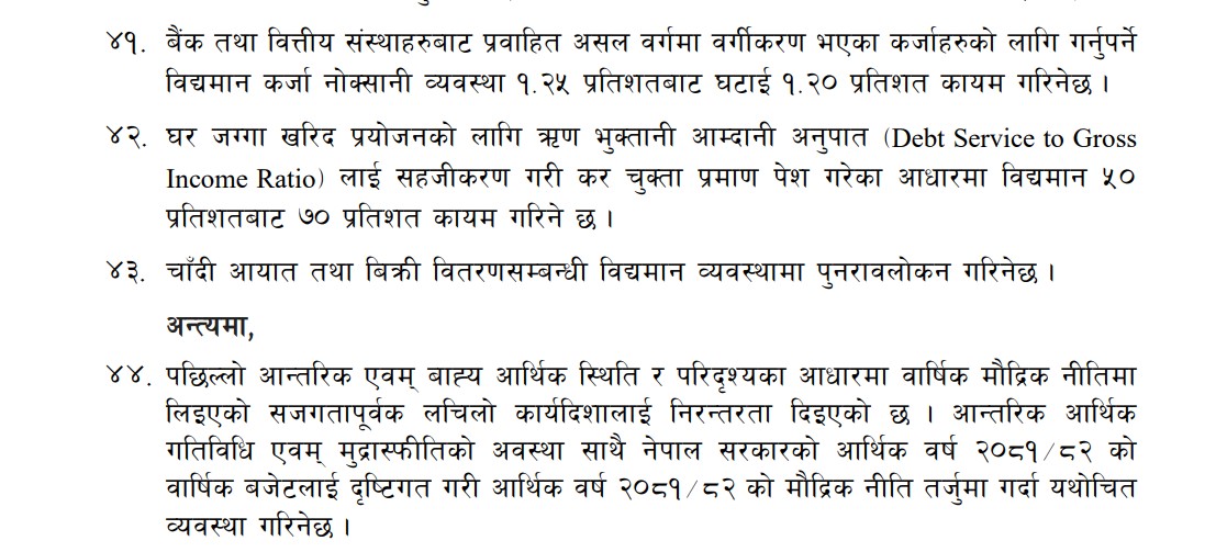 मौद्रिक नीतिको समीक्षामा कर चुक्ता प्रमाणपत्र पेश गरेको आधारमा घरजग्गा खरिद प्रयोजनको लागि ऋण भुक्तानीको लागि आम्दानी गणना गर्दा हाल कायम रहेको ५० प्रतिशत रेसियोलाई बृद्धि गरी ७० प्रतिशत पुर्याउने निर्णय गरिएको छ । यसबाट आम्दानी कम भएका व्यक्तिले पनि घरजग्गा खरिद गर्न पाउने भएका छन् ।