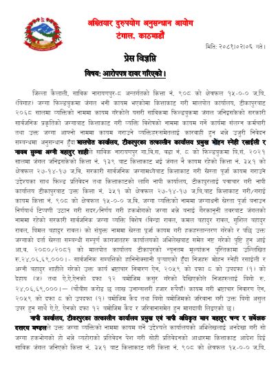 आयोगले आइतबार मोलपोत कार्यालय टीकापुर, कैलालीका तत्कालीन कार्यालय प्रमुख मोहन स्नेही रसाईली, नापी कार्यालय, टीकापुरका तत्कालीन कार्यालय प्रमुख एवं नापी अधिकृत मानबहादुर चन्दसमेत ८ जनाविरुद्ध गैरकानूनी रुपमा व्यक्ति विशेषलाई लाभ पुर्याइ राज्यलाई हानी पुर्याएको दाबी गर्दै मुद्दा दायर गरेको हो।