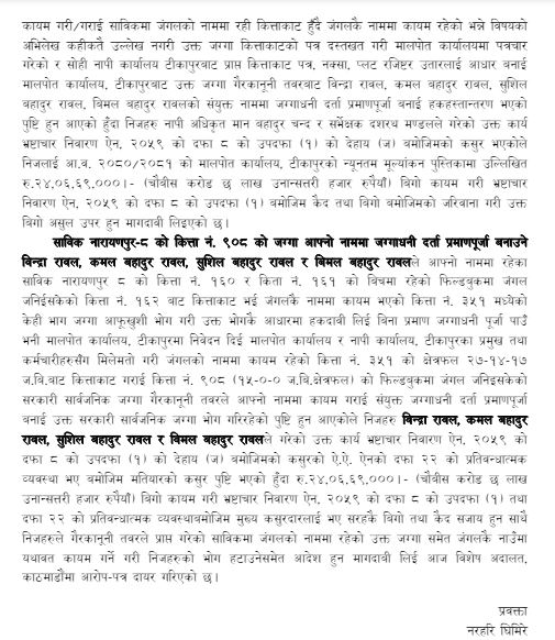 आयोगका प्रवक्ता नरहरि घिमिरेका अनुसार साविक नारायणपुर–८ अन्तर्गतको कित्ता नं ९०८ को क्षेत्रफल १५ बिगाह सार्वजनिक जग्गा २०६८ सालमा व्यक्तिको नाममा पुर्याएको दाबी गर्दै आयोगले मुद्दा दायर गरेको हो। उक्त जग्गा फिल्डबुकमा जंगल जनिइसकेर सरकारी सार्वजनिक प्रकृतिको जग्गा भए पनि गैरकानुनी रुपमा कित्ताकाट गरी व्यक्तिको नाममा नामसारी भएको थियो।