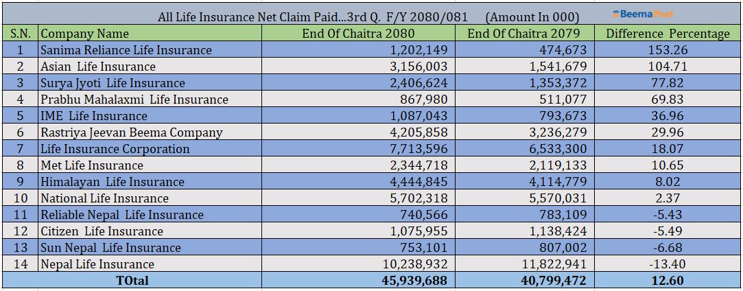 अघिल्लो आर्थिक वर्षको सोही अवधिको तुलनामा प्रभु महालक्ष्मी लाइफको ६९ प्रतिशत, आइएमई लाइफको ३६ प्रतिशत, राष्ट्रिय जीवन बीमा कम्पनीको २९ प्रतिशत र अन्य कम्पनीहरुको २० प्रतिशतभन्दा मुनीले खुद दावी भुक्तानी वृद्धि भएको छ । साथै, चार कम्पनीको उक्त दावी भुक्तानी रकम सामान्य अंकले घटेको छ । कम्पनीहरुले प्रकाशित गरेको तेस्रो त्रैमाससम्मको वित्तीय विवरणमा रहेको क्लेम सेडेडलाई घटाई कम्पनीहरुको खुद बीमा दावी भुक्तानीको विवरण निकालेको हो ।
