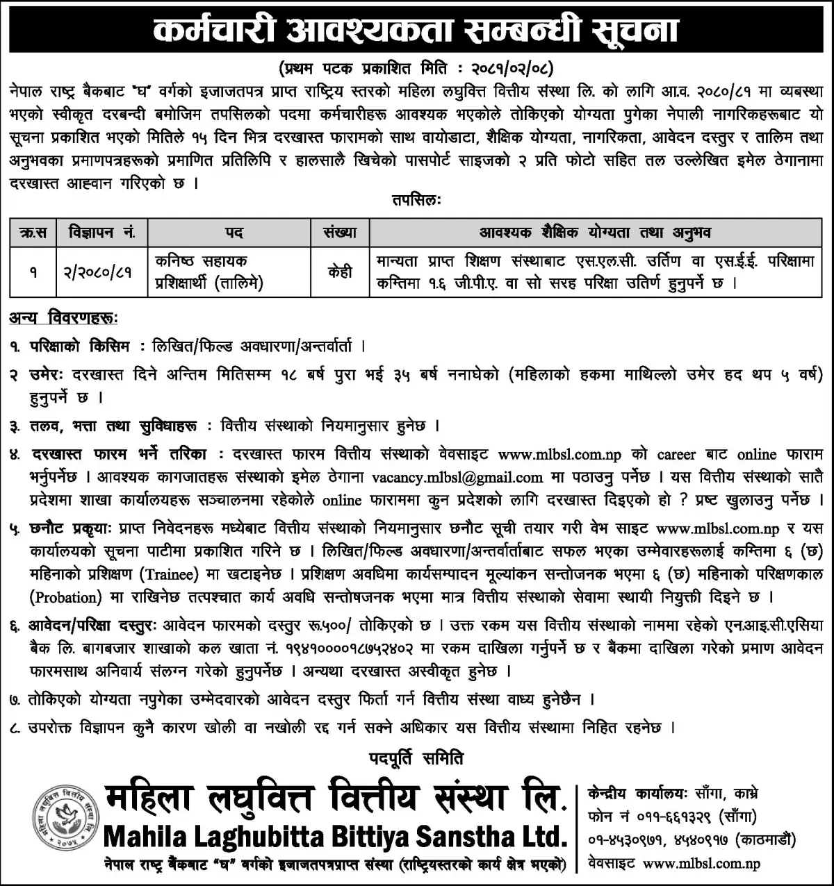 महिला लघुवित्तले माग्यो कर्मचारी, एसईई उत्तीर्णलाई अवसर