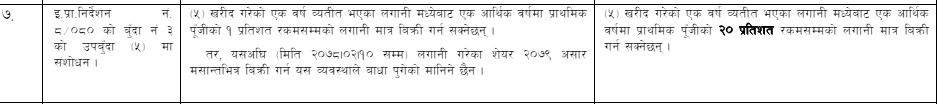 यही व्यवस्थाको कारण पछिल्लो समय शेयर बजारमा सकारात्मक प्रभाव परेको छ। आइतबारदेखि भने सो व्यवस्थमा कार्यन्वयनमा आएको छ।यसअघि खरीद गरेको एक वर्ष व्यतीत भएका लगानी मध्येबाट एक आर्थिक वर्षमा प्राथमिक पूँजीको १ प्रतिशत रकमसम्मको लगानी मात्र बिक्री गर्न सक्ने व्यवस्था थियो।