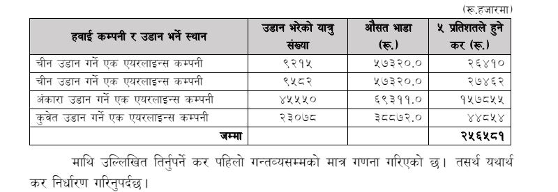 महालेखाले कर छलिमा लाग्ने शुल्क तथा ब्याज असुल गर्न छानबिन गर्नुपर्ने बताएको छ । नेपाल नागरिक उड्डयन प्राधिकरणबाट प्राप्त विवरण अनुसार आन्तरिक राजस्व कार्यालय, पुतलीसडकमा दर्ता रहेका ४ हवाई कम्पनीले विभिन्न गन्तव्यमा नेपालबाट उडान भर्दा निम्नानुसार कर दाखिला गरेको नपाइएकोले रू २५ करोड ६५ लाख ८१ हजार र सोमा लाग्ने शुल्क तथा ब्याज असुल गर्न छानबिन गर्नुपर्दछ प्रतिवेदनमा भनेको छ ।