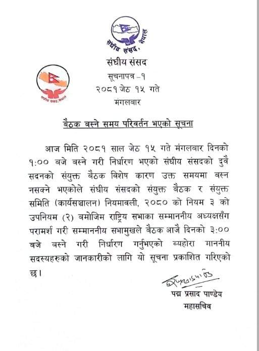 दिउँसो १ बजेका लागि बोलाइएको बैठक दिउँसो ३ बजेका लागि सारिएको छ ।