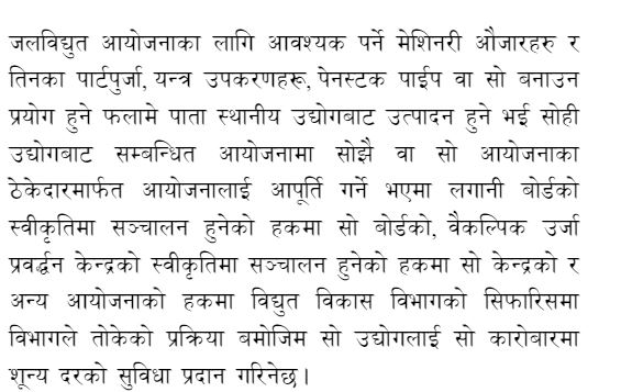 जलविद्युत आयोजनाका लागि आवश्यक पर्ने मेशिनरी औजारहरु र तिनका पार्टपुर्जा, यन्त्र उपकरणहरू, पेनस्टक पाईप वा सो बनाउन प्रयोग हुने फलामे पाता स्थानीय उद्योगबाट उत्पादन हुने भई सोही उद्योगबाट सम्बन्धित आयोजनामा सोझै वा सो आयोजनाका ठेकेदारमार्फत आयोजनालाई आपूर्ति गर्ने भएमा कारोबारमा शून्य दरको सुविधा प्रदान गरिनेछ ।