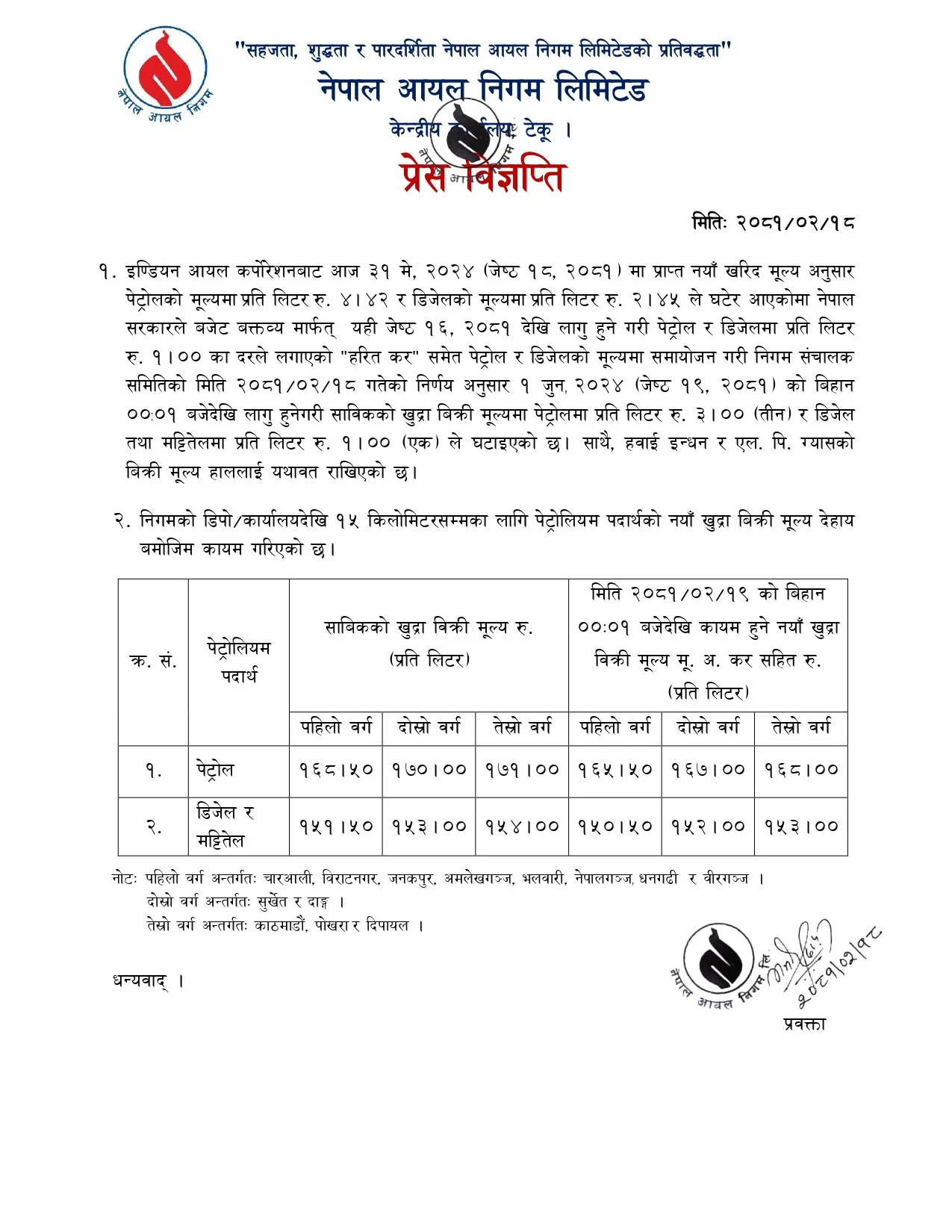 नेपाल आयल निगमले पेट्रोलको प्रतिलिटर ३ रुपैयाँ र डिजेल तथा मट्टीतेलको प्रतिलिटर १ रुपैयाँ घटाउने निर्णय गरेको हो।