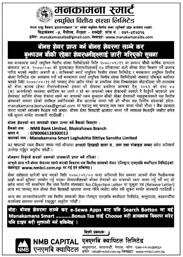 साविकको स्मार्ट लघुवित्त वित्तीय संस्था र मनकामना लघुवित्त वित्तीय संस्था आपसमा मर्ज भई मनकामना स्मार्ट लघुवित्तको नामबाट २०७७ साउन ११ गते एकीकृत कारोबार थालेको थियो । कम्पनीले तत् पश्चात् शेयर खरिद गरेका वा आईपीओ बाँडफाँडमा परी हालसम्म उक्त शेयर कायम रहेको शेयरधनीको हकमा सो शयरबापतको कर तिर्न भनेको हो । करबापतको रकम जम्मा गराएपछि मात्रै बोनस शेयर डिम्याट खातामा जम्मा गराईने कम्पनीले जनाएको छ ।