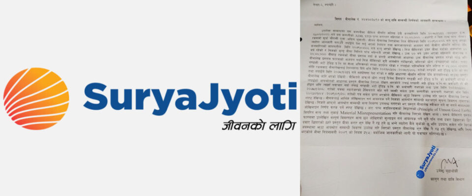 काठमाडौं । सुर्य ज्योति लाइफले नेपालको जीवन बीमा क्षेत्र नै बद्नाम हुने गरी ठगी धन्दा सञ्चालन गरेको तथ्य बीमापोष्टले फेला पारेको छ । जीवन बीमा भनेकै जोखिम र बचत दुवै हो । तर, सुर्यज्योति लाइफमा चौरासी पुजा नामक बीमा पोलिसी लिएकी रुपन्देहीकी सतियादेवी कलवारिनको निधनपछि बीमा दावी भुक्तानी दिनुको साटो जीवन बीमा पोलिसी नै रद्द गरेर सुर्यज्योति लाइफले बीमितलाई ठगी गरेको तथ्य फेला परेको छ । बीमित गोनहा– ६ रुपन्देहीकी सतियादेवी कलवारिनले २०७८।११।१३ गते सुर्य ज्योति लाइफको भैरहवास्थित शाखाबाट २० लाख रुपैयाँ बीमाङ्क चौरासी पुजा जीवन बीमालेख पोलिसी लिएकी थिईन् । निज बीमितको २०७९।०४।०६ गते निधन भएको थियो । बीमितको निधन पश्चात हकवाला छोरा दिनेश जैसवालले बीमा कम्पनीमा दावी भुक्तानी माग गर्दै निवेदन दिएकोमा दावी भुक्तानी दिनुको साटो बीमितको निधन भएको ७ महिना ७ दिन पछि सिईओ प्रकाश बिक्रम खत्रीले बीमितको नाममा जारी भएको बीमा पोलिसी नै रद्द गर्ने र दावी भुक्तानी नदिने निर्णय गरेको तथ्य भेटिएको छ । कम्पनीका कानुन तथा दावी विभाग कर्मचारी उमेश बुढाथोकीले हस्ताक्षर गरेर बीमितका हकवावा दिनेश जैसवाललाई दिएको पत्रमा उनकी आमा सतिया देवी कलवारिनको बीमा पोलिसी रद्द भएको र यसअघि बुझाएको रकम समेत फिर्ता नहुने उल्लेख गरेका छन् । कलवारिनले मर्नु अघि जीवनभरको कमाई जम्मा गरेर चार लाख रुपैयाँ अग्रिम भुक्तानी बापत बुझाएकी थिईन् … Continue reading सुर्यज्योति लाइफद्वारा बीमा प्राधिकरण, बीमाको सिद्धान्त र ऐन कानुनमाथि खुलेआम चुनौती, बीमितको निधनपछि बीमा पोलिसी रद्द