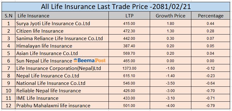आइतबार लाइफ इन्स्योरेन्स इन्डेक्स ०.२० प्रतिशत अर्थात २० अंकले घटेर १०,१४९ को बिन्दुमा कायम भएको छ । आज सूर्यज्योति लाइफ इन्स्योरेन्सको शेयरमूल्य सर्वाधिक बढेको छ । कम्पनीको शेयरमूल्य ०.४४ प्रतिशतले बढेर ४१५ रुपैयाँमा कारोबार भएको छ ।