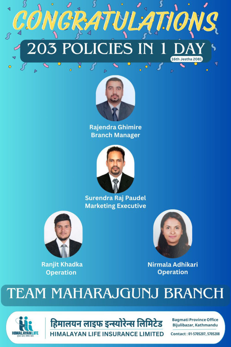 कम्पनीको महारागंज शाखा प्रमुख राजेन्द्र घिमिरेले सम्पूर्ण अभिकर्ताहरुको सहकार्यमा एकैदिन २०३ पोलिसी बिक्री गर्न सफल भएको बताए । उनले भने, ‘मैले एउटाँ दृढ सोच र लक्ष्य लिएर अभिकर्ताहरुसँग सहकार्य गरी सोही कुरा प्राप्तिको लागि दिन रात काम गरे अनि सफल भए।’
