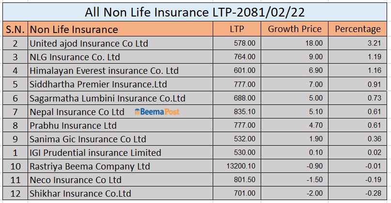 साथै, नन लाइफ इन्स्योरेन्स उपसूचक पनि आज ०.५६ प्रतिशत अर्थात ५९ अंकले बढेर १०,६३४ को विन्दुमा कायम भएको छ । आज कारोबार भएका अधिकांश कम्पनीको शेयरमूल्यमा हरियाली छाएको छ ।