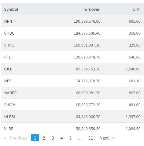 त्यस्तै, सिईडिबी हाईड्रोपावर, सानिमा माई, पोखरा फाइनान्स, ग्लोबल आइएमई लघुवित्त, नेपाल फाइनान्स, नाडेप लघुवित्त, शिवम सिमेन्टस, हिमालयन लघुवित्त र विजय लघुवित्तको सर्वाधिक कारोबार भएको छ।