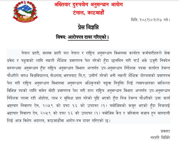 काठमाडौँ । अख्तियार दुरूपयोग अनुसन्धान आयोगले राष्ट्रिय अनुसन्धान विभागका उपअनुसन्धान निर्देशक हेमन्त चौधरीविरुद्ध मुद्दा दायर गरेको छ। नक्कली शैक्षिक प्रमाणपत्रको आरोपमा उनीविरुद्ध आइतबार विशेष अदालत काठमाडौँमा मुद्दा दायर भएको अख्तियारले जनाएको छ।