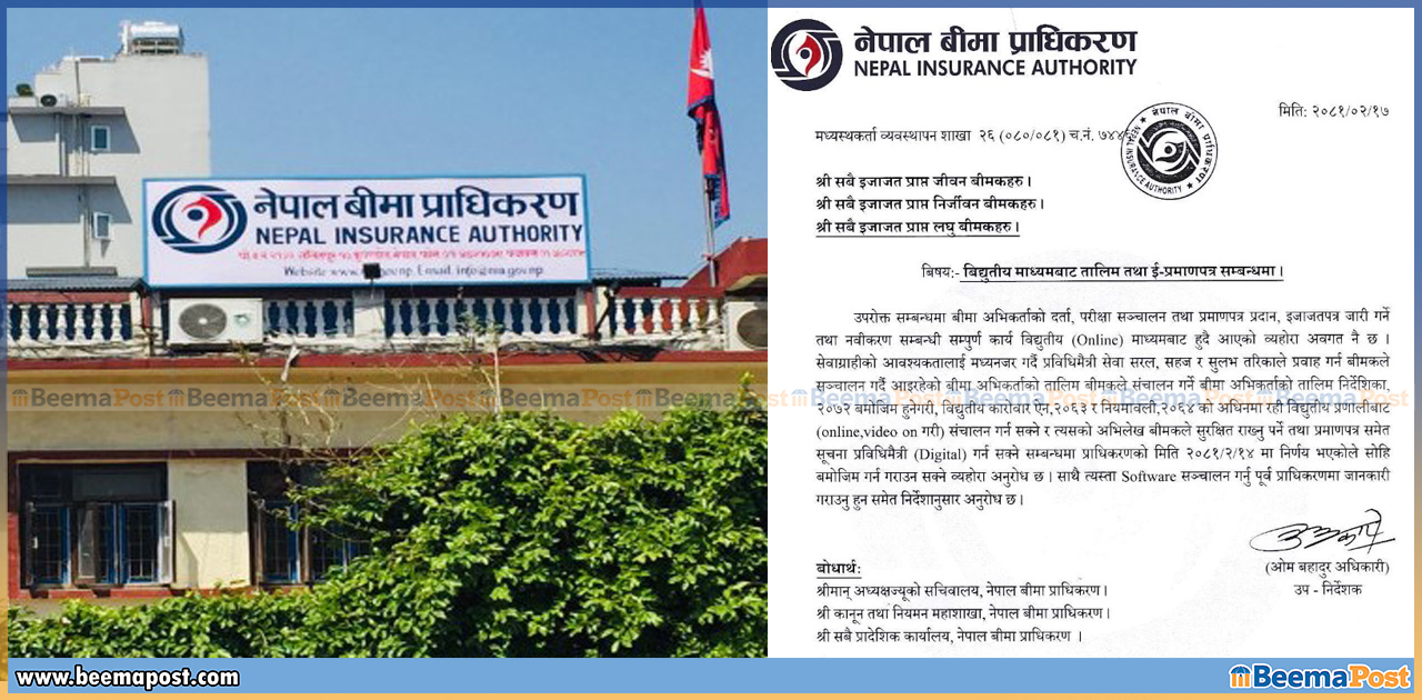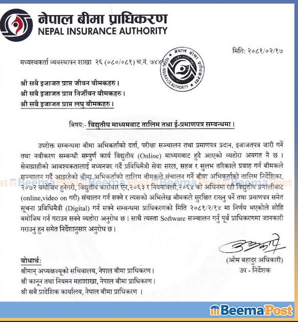 प्राधिकरणले बीमा कम्पनीहरुले संचालन गर्दै आइरहेको बीमा अभिकर्ताको तालिम निर्देशिका २०७२ बमोजिम हुनेगरी, विद्युतीय कारोबार ऐन, २०६४ को अधिनमा रही विद्युतीय प्रणलीबाट अनलाईन, भिडियो अन गरी संचालन गर्न सक्ने सम्बन्धमा प्राधिकरणबाट भएको निर्णय भएकाले बीमा कम्पनीहरुलाई सोहि बमोजिम गर्न र गराउन बीमा प्राधिकरणले निर्देशन दिएको हो । प्राधिकरणले सो व्यवस्था लागू गर्न प्रयोगमा ल्याईने सफटवयर संचालन गर्नु अघि बीमा प्राधिकरणमा जानकारी दिन समेत आग्रह गरेको छ।