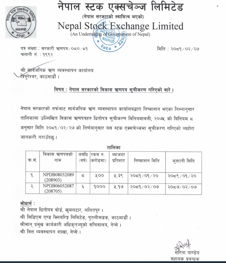 सरकारको तर्फबाट राष्ट्र बैंकले निष्कासन गरेका रू।५ अर्बको विकास ऋणपत्र ‘एनपीडीबी०८०३२०८९ ९२०८९०३० र रू। १० अर्बको ‘एनपीडीबी०६०५२०८७ ९२०८७०५० नेप्सेमा सूचीकृत भएका हुन् ।