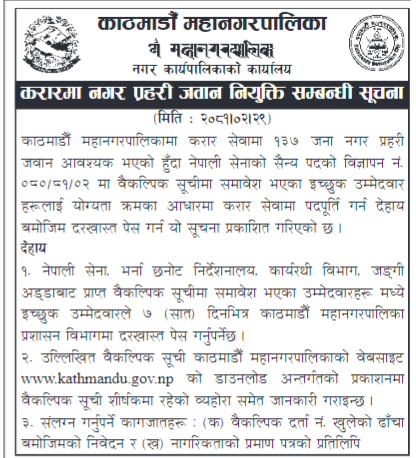 काठमाडौँ । काठमाडौँ महानगरपालिकाले करार सेवामा नगर प्रहरी नियुक्तिका लागि दरखास्त आह्वान गरेको छ । नेपाली सेनाको सैन्य पदको विज्ञापन नं. ०८०।८१।०२ मा वैकल्पिक सूचीमा समावेश भएका इच्छुक उम्मेदवारलाई नियुक्ति गर्ने गरी महानगरले १३७ जना नगर प्रहरी जवानका लागि आवेदन माग गरेको हो ।