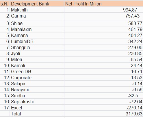दोस्रोमा , गरिमा विकास बैंकले ७५ करोड ७४ लाख र साइन रेसुङ्गा डेभलपमेन्ट बैंकले ५८ करोड ३७ लाख रुपैयाँ खुद नाफा आर्जन गरेको छ ।