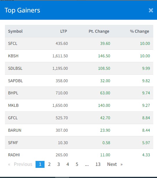 त्यस्तै, सप्तकोशी डेभलपमेन्ट बैंकको शेयरमूलय ९.८२ प्रतिशत, बाराही हाइड्रोपावरको ९.७४ प्रतिशत र यी वाहेकका अन्य कम्पनीको शेयरमूल्य सर्वाधिक बढेको छ ।