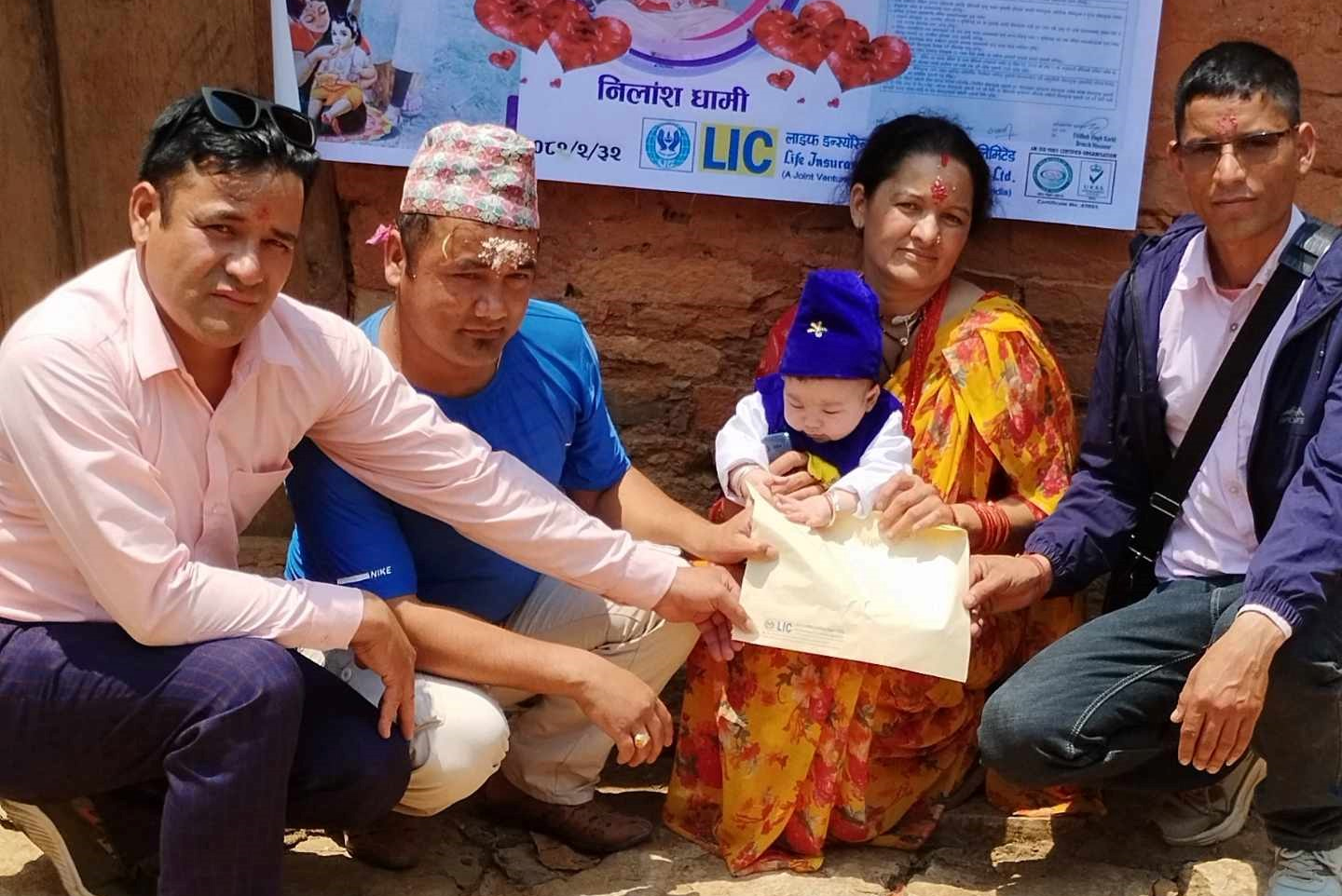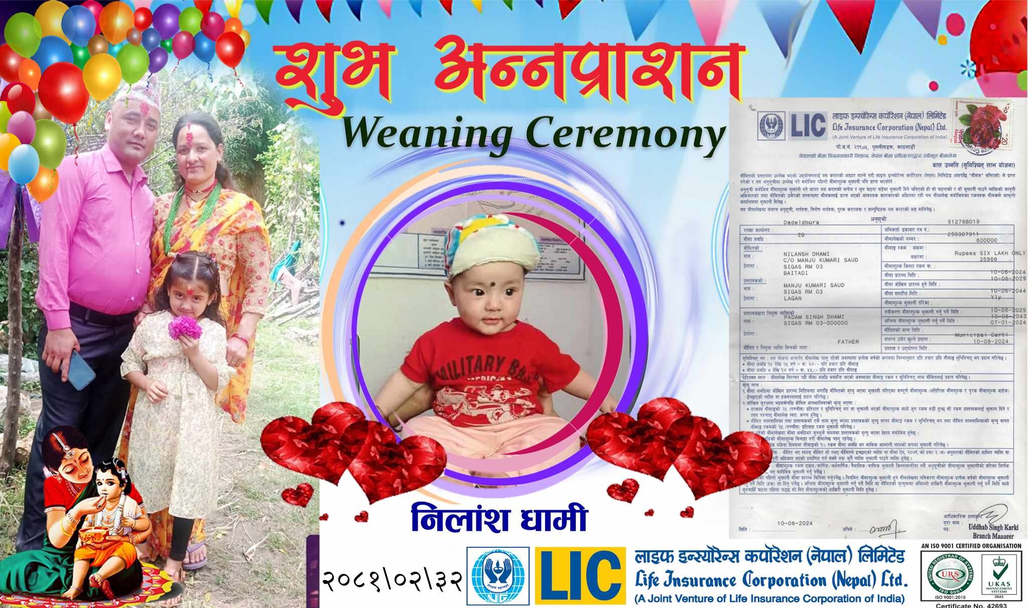 यसैक्रममा बैतडीको सिगासँ गाउँपालिकाको वडा नम्बर ३ मा बसोबास गर्ने बुवा पदम धामी र आमा मन्जु कुमारी साउँदले आफ्नो छोरा निलांश धामीको अन्नप्राशनको अबसरमा बीमा पोलिसी उपहाँर दिएका छन् । उनीहरुले एलआईसी नेपालको डढेल्धुरा शाखाबाट ६ लाख रुपैयाँ बिमांक भएको ‘बाल उन्नती प्लान’ बीमा पोलिसी दिएका हुन् ।
