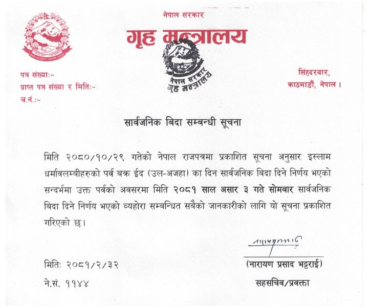 आगामी सोमबार देशभर सार्वजनिक बिदा
