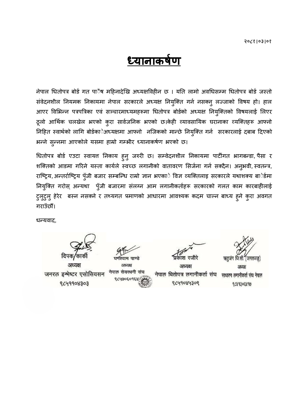 ‘धितोपत्र बोर्ड एउटा स्वायत्त निकाय हुनु जरुरी छ । सम्वेदनशील निकायमा पार्टीगत भागबन्डा, पैसा र शक्तिको आडमा गरिने यस्ता कार्यले स्वच्छ लगानीको वातावरण सिर्जना गर्न सक्दैन । अनुभवी, स्वतन्त्र, राष्ट्रिय, अन्तर्राष्ट्रिय पुँजी बजार सम्बन्धि राम्रो ज्ञान भएका विज्ञ व्यक्तिलाइ सरकारले यथाशक्य बोर्डमा नियुक्ति गरोस् अन्यथा पुँजी बजारमा संलग्न आम लगानीकर्ताहरू सरकारको गलत काम कारबाहीलाई टुलुटुलु हेरेर बस्न नसक्ने र तथ्यगत प्रमाणको आधारमा आवश्यक कदम चाल्न बाध्य हुने कुरा अवगत गराउँछौं’ विज्ञप्तिमा उल्लेख गरीएको छ ।