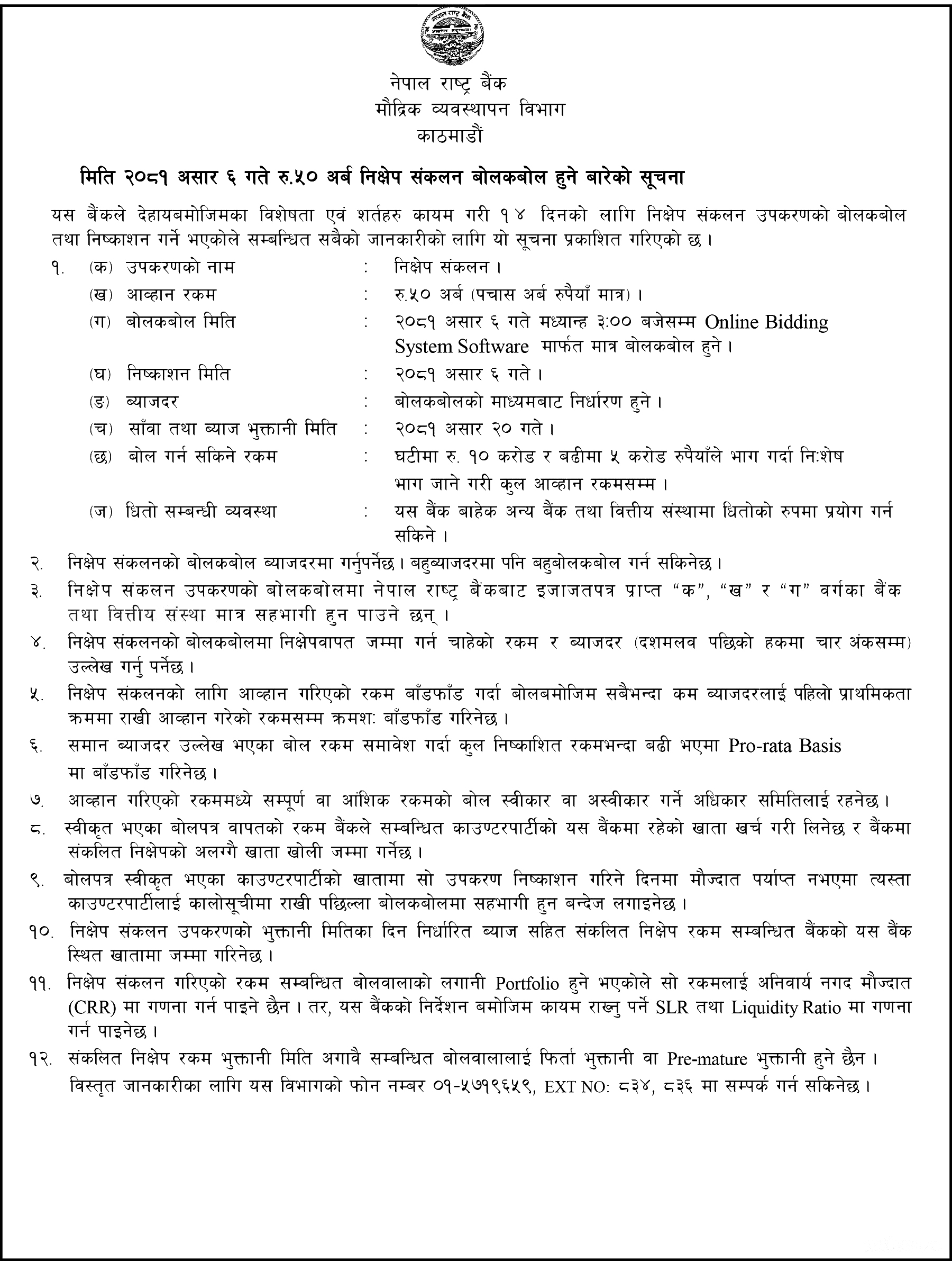 राष्ट्र बैंकले बजारमा भएको तरलता व्यवस्थापन गर्न समय समयमा निक्षेप संकलन उपकरण जारी गर्दै आइरहेको छ । अहिले राष्ट्र बैंकले १४ दिनको लागि निक्षेप संकलन जारी गर्न लागेको हो । यसमा दिउँसो ३ बजे देखि अनलाईन बिडिङ्ग सिस्टम सफ्टवेयरमार्फत बोलकबोल गर्न सकिनेछ ।