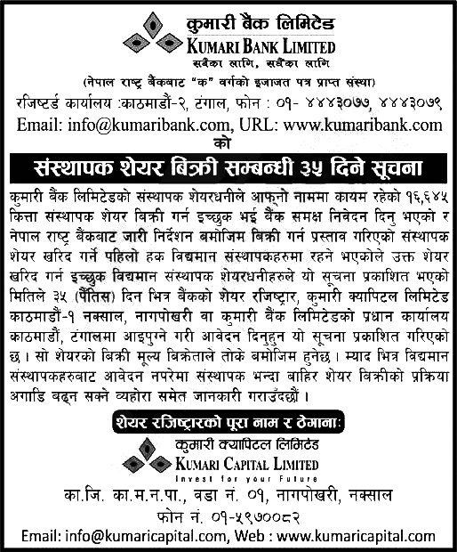 काठमाडौं । कुमारी बैंक लिमिटेडले संस्थापक शेयर बिक्रीमा ल्याएको छ । बैंकले संस्थापक शेयरधनीको नाममा रहेको १६ हजार ६४५ कित्ता शेयर बिक्रीमा ल्याएको हो ।
