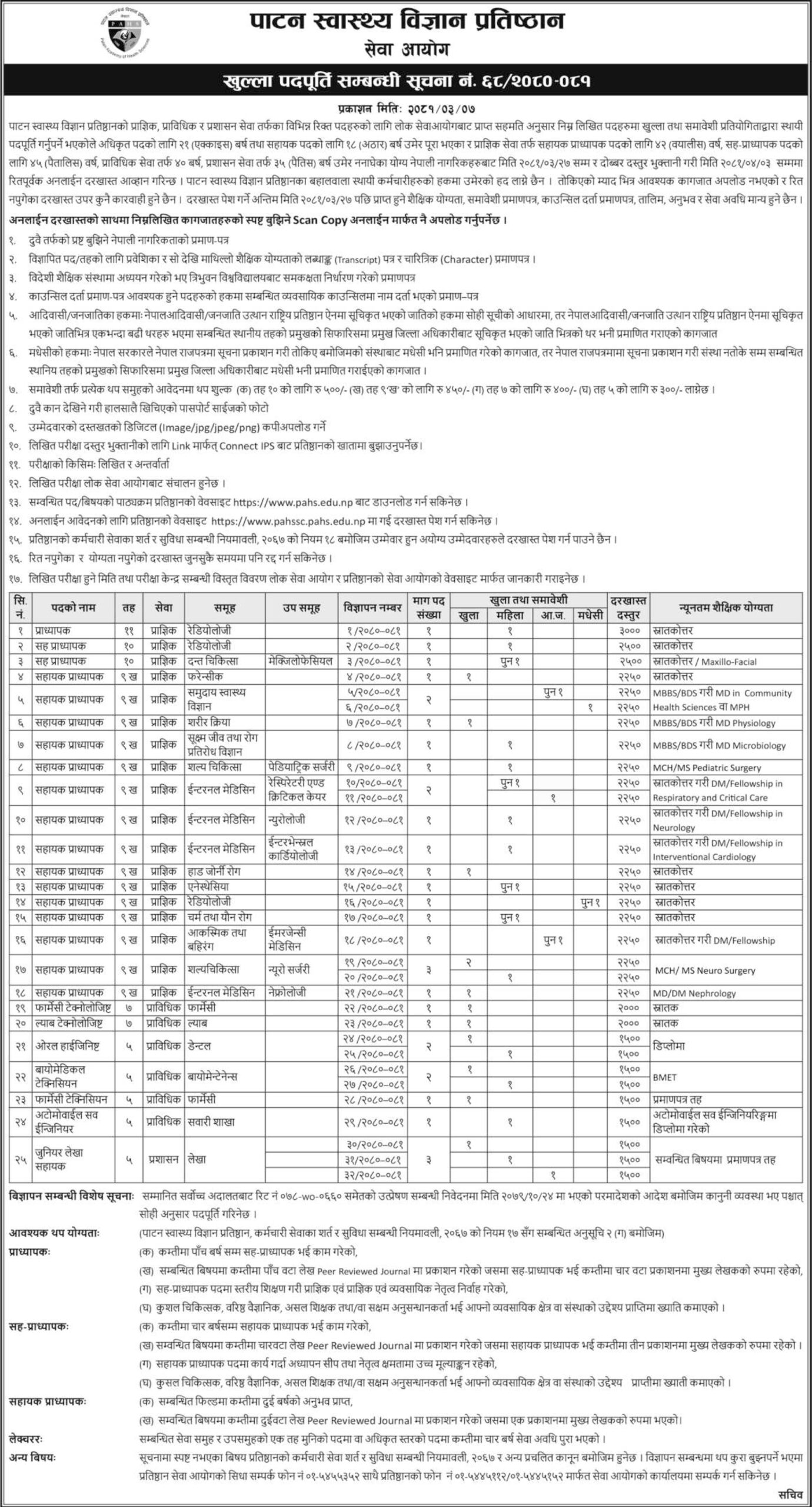 प्रतिष्ठानले प्राध्यापक, सह प्राध्यापक, सहायक प्राध्यापक, फार्मेसी टेक्नोलोजिष्ट, ल्याब टेक्नोलोजिष्ट, ओरल हाईजिनिष्ट, बायोमेडिकल टेक्निसियन, फार्मेसी टेक्निसियन, अटोमोबाईल सव इन्जिनियर र जुनियर लेखा सहायक पदको विभिन्न तह, सेवा, समूह तथा उपसमूहमा ३३ जना कर्मचारी माग गरेको छ ।
