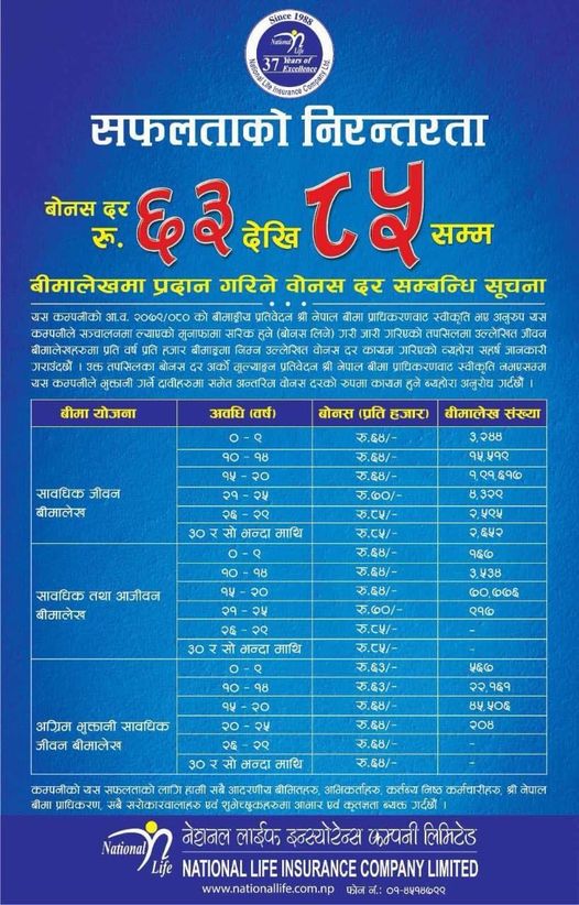 नेशनल लाइफ इन्स्योरेन्सको नयाँ बोनसदर सार्वजनिक, अधिकतम ८५ रूपैयाँसम्म बोनश पाउने