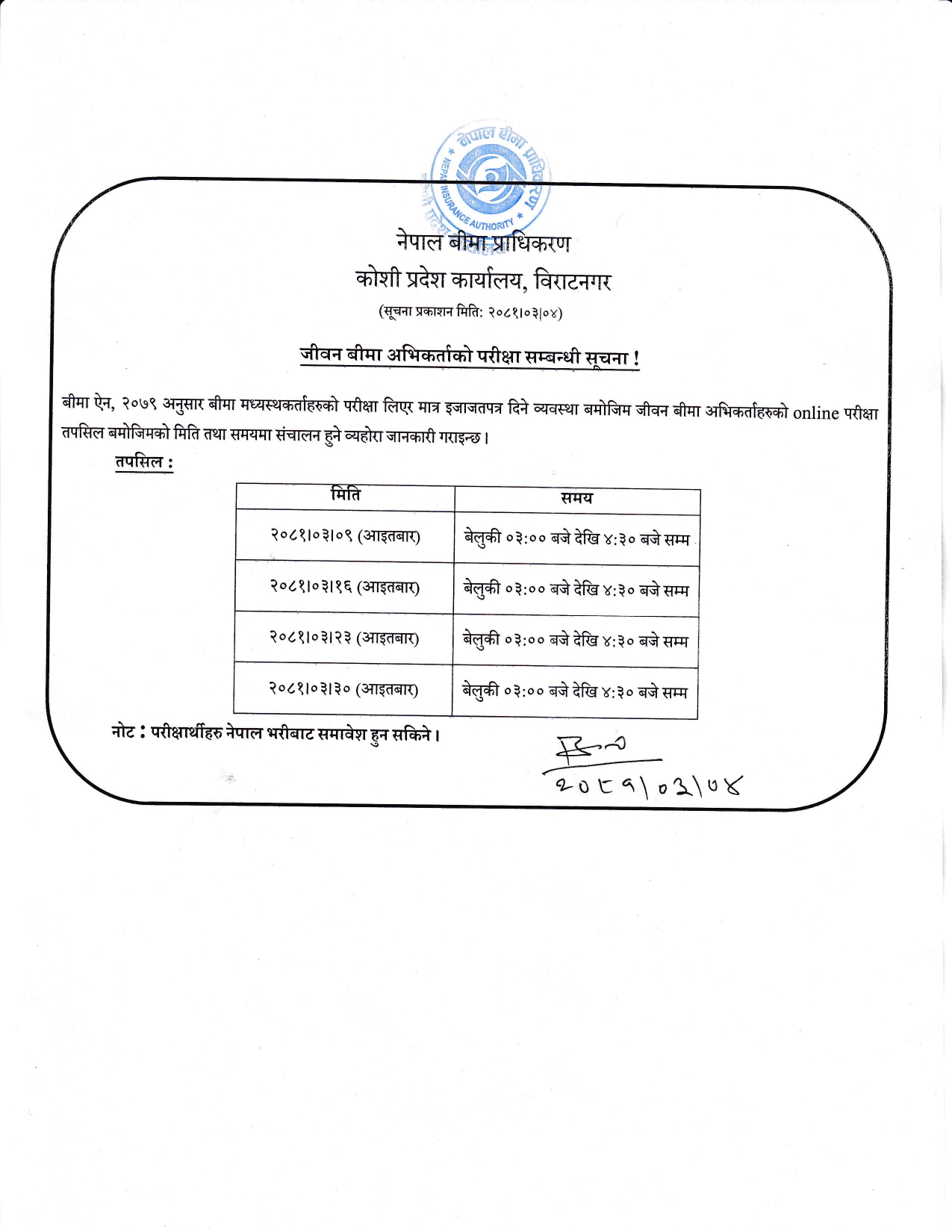 परीक्षा असार ९, १६, २३ र ३० गते अनलाइन माध्यमबाट हुनेछ । परीक्षा बेलुकी ३ बजे देखि साढे ४ बजेसम्म सञ्चालन हुनेछ । परीक्षामा नेपाल भरीका परीक्षार्थिहरू समावेश हुन सकिने बीमा प्राधिकरणले जनाएको छ ।