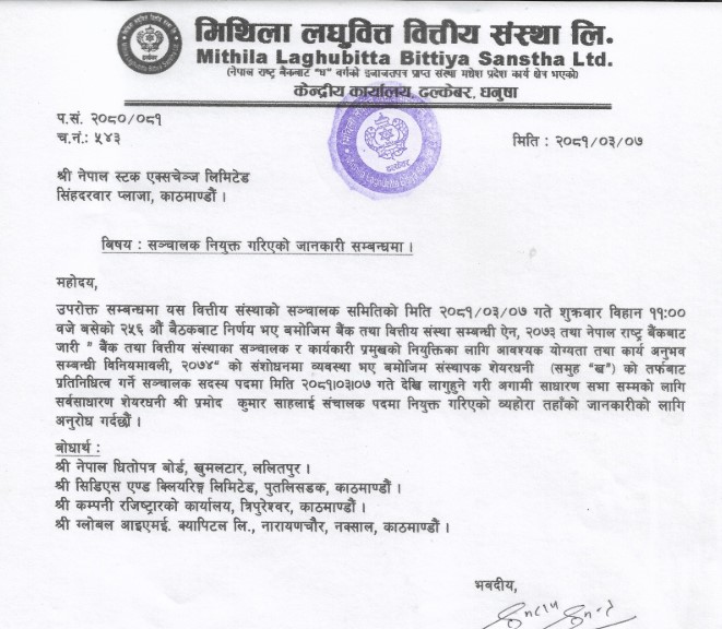 काठमाडौं । मिथिला लघुवित्त वित्तीय संस्था लिमिटेडको सञ्चालकमा सर्वसाधारण समुहको तर्फबाट प्रमोद कुमार शाहलाई नियुक्त गरेको छ ।
