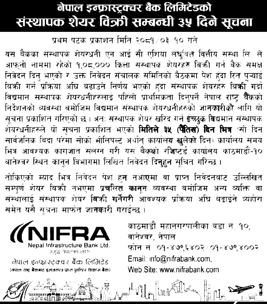 काठमाडौं । एनआईसी एशिया लघुवित्त वित्तीय संस्था लिमिटेडको स्वामित्वमा रहेको नेपाल इन्फ्रान्ट्रक्चर बैंक लिमिटेडको एक लाख आठ हजार कित्ता संस्थापक शेयर बिक्रीमा राखिएको छ । बैंकले संस्थापक शेयरधनीहरूले मात्रै किन्न पाउने गरी शेयर बिक्रीमा राखेको हो ।