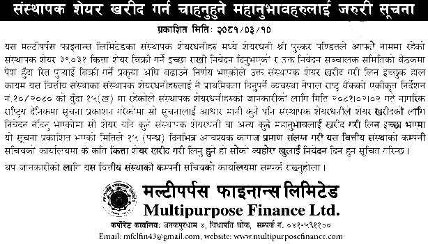 काठमाडौं । मल्टीपर्पस फाइनान्स लिमिटेडले संस्थापक शेयर बिक्रीमा ल्याएको छ । कम्पनीले संस्थापक शेयरधनीको नाममा रहेको ३९ हजार ३१ कित्ता संस्थापक शेयर बिक्रीमा ल्याएको हो ।