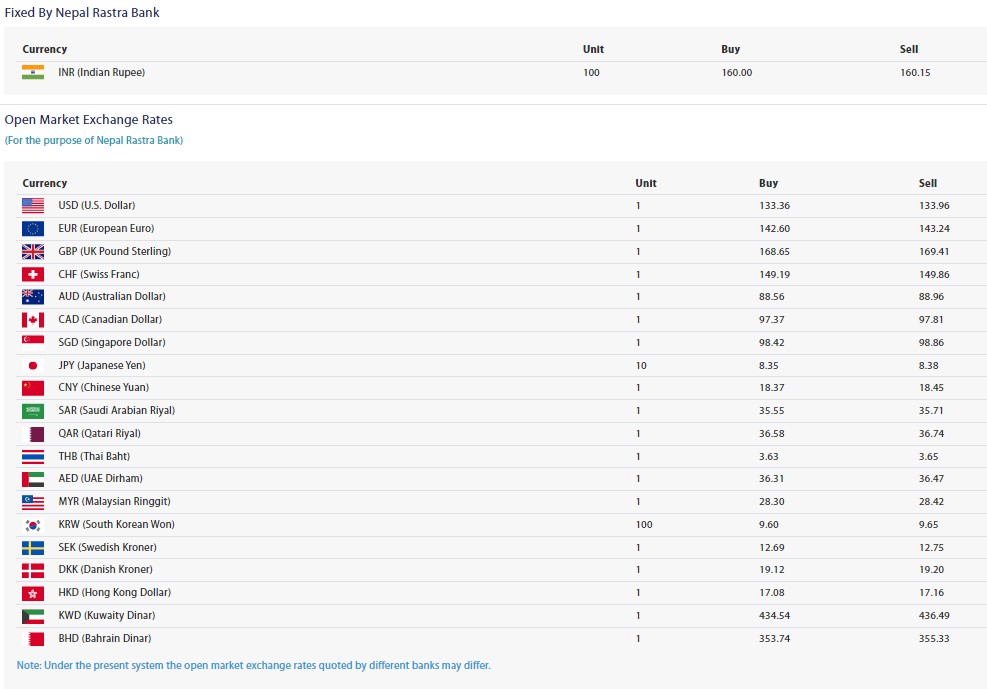 काठमाडौं । नेपाल राष्ट्र बैंकले असार १० गतेका लागि विदेशी मुद्राको विनिमयदर तोकेको छ । जसअनुसार एक अमेरिकी डलरको खरिददर १३३.३६ रुपैयाँ छ भने बिक्रीदर १३३.९६ रुपैयाँ रहेको छ ।