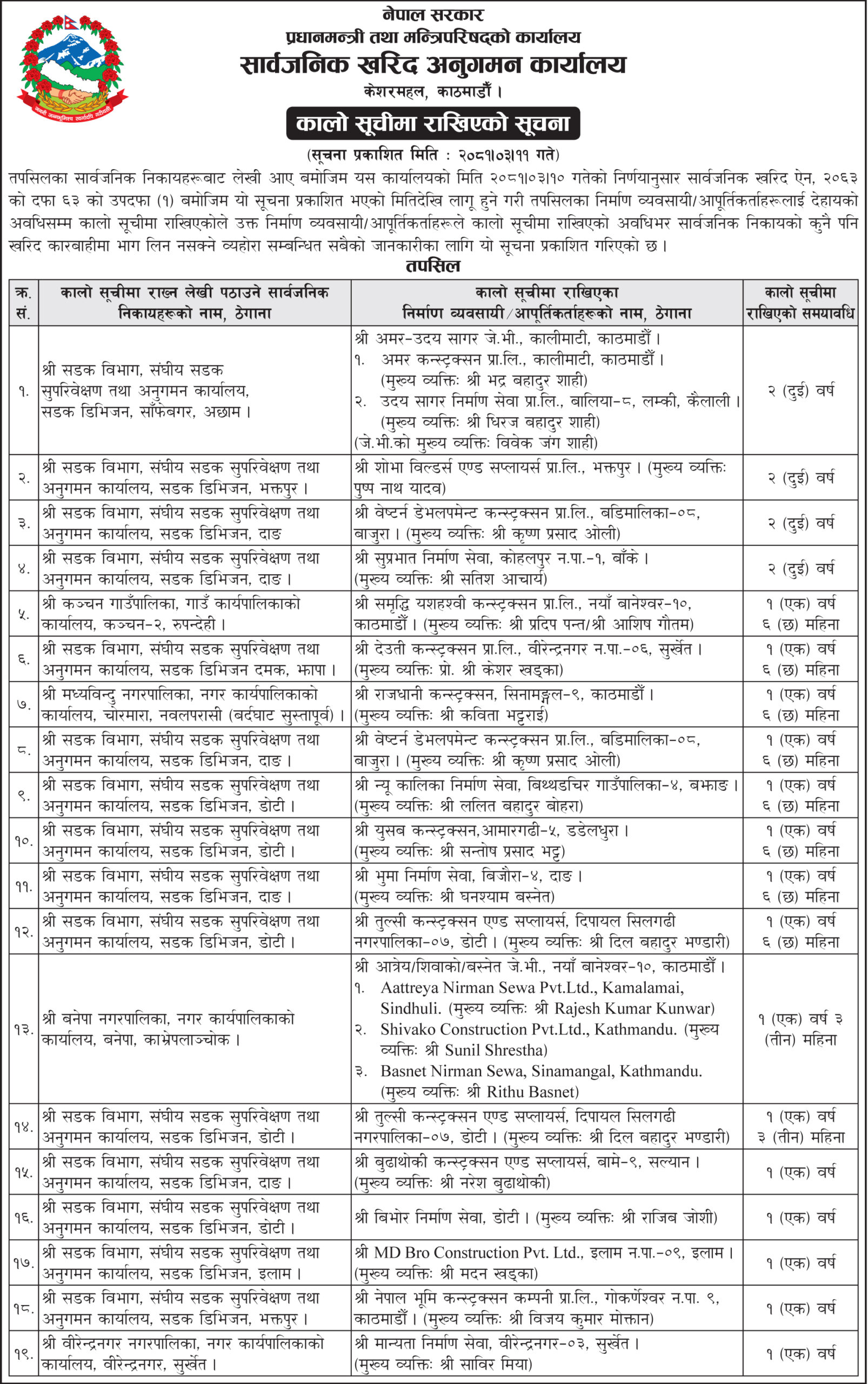 कार्यालयले पाँच ठेकेदार कम्पनीहरूलाई दुई वर्षसम्म, आठ ठेकेदार कम्पनीहरूलाई एक वर्ष ६ महिनासम्म, चार ठेकेदार कम्पनीहरूलाई एक वर्ष तीन महिना र पाँच ठेकेदार कम्पनीहरूलाई एक वर्षका लागि कालो सूचीमा समावेश गरेको हो ।