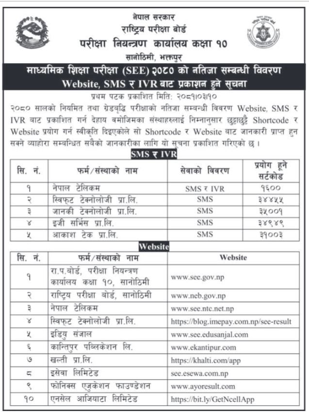 २०८० सालको नियमित तथा ग्रेड वृद्धि परीक्षाको नतिजा सम्बन्धी विवरण वेबसाइट, एसएमएस र आइभिआरबाट प्रकाशित गर्ने भएको जनाएको हो ।