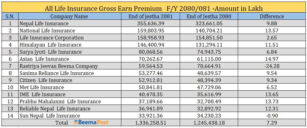 गत आवको तुलनामा जीवन बीमा कम्पनीहरुको कुल बीमा शुल्क आर्जन ७५ ले बढ्यो, नेपालर नेशनल लाइफ अग्रस्थानमा, अन्यको अवस्था कस्तो ?